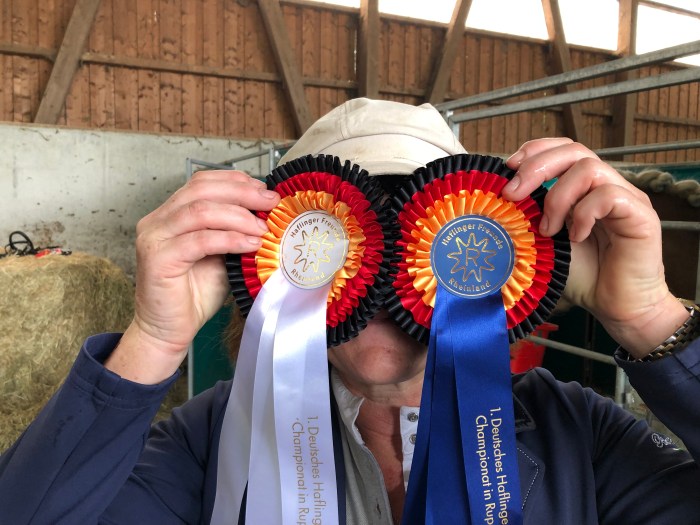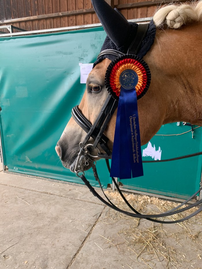 Sechs Starts, zwei Schleifen, einmal Reservesieger, viele tolle Begegnungen: Das Haflinger-Championat in Bölkum / Ruppichteroth liegt hinter uns. Sportlich erfreulich war vor allem die Schleifenpremiere des Youngsters und Pferdepodcast-Hauptakteurs AC/DC. Der dreijährige Haflinger belegte in der Reitpferdeprüfung den dritten Platz, und zwar mit einer Gesamtnote von 7,5.