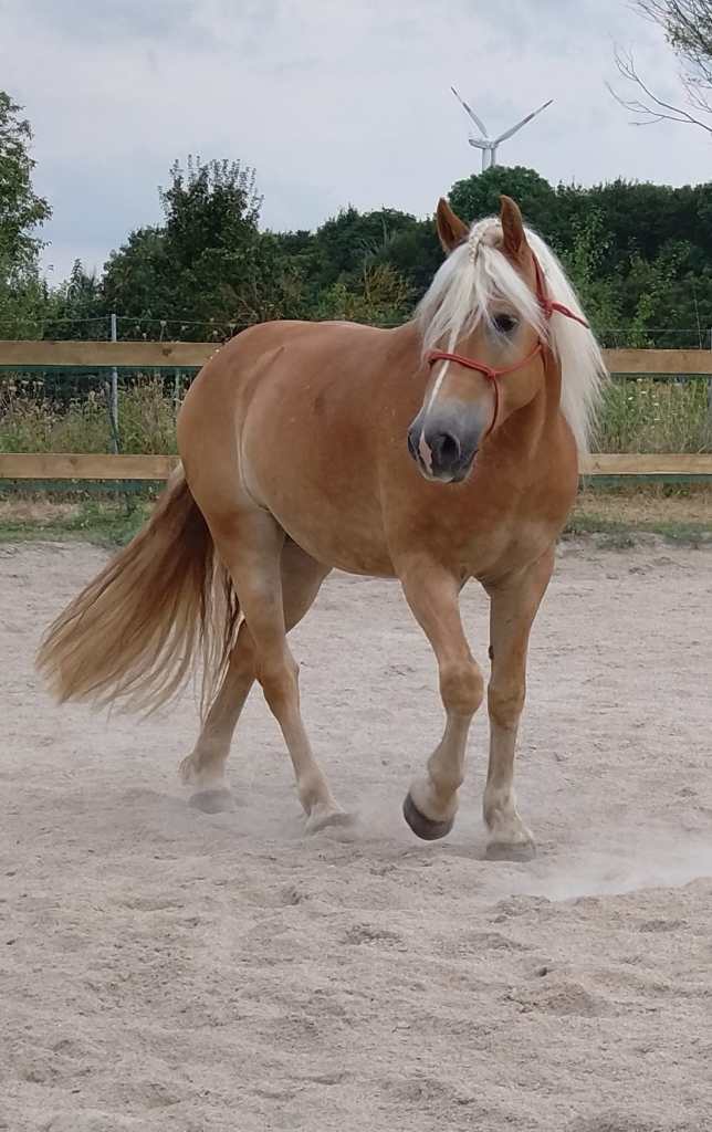 Die letzten 11 km vergehen wie im Flug, und das Haflingertier ist voller Energie. Wunderbare Graswege am Waldrand laden zum Galoppieren ein.